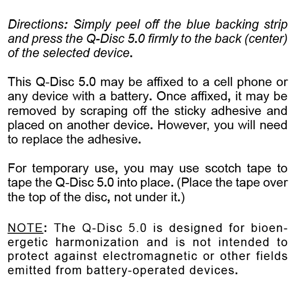Directions: Simply peel off the blue backing strip and press the Q-Disc 5.0 firmly to the back (center) of the selected device. Please wipe the surface first so it is clean before affixing the Q-Disc.
