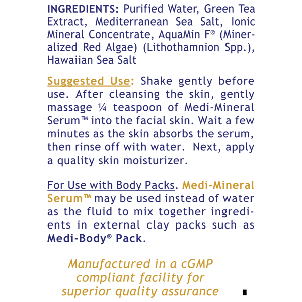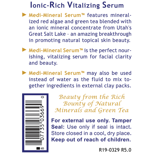 Medi-Mineral Serum™ features features mineralized red algae and green tea blended with an ionic mineral concentrate from Utah's Great Salt Lake – an amazing breakthrough in promoting natural topical skin beauty.